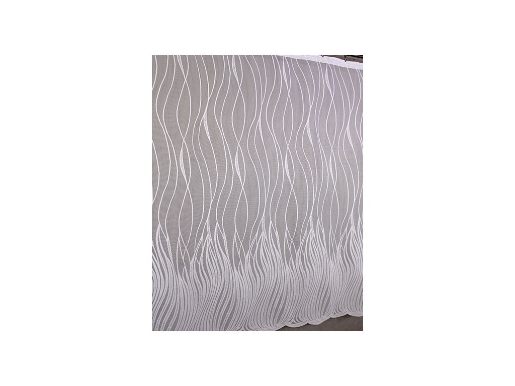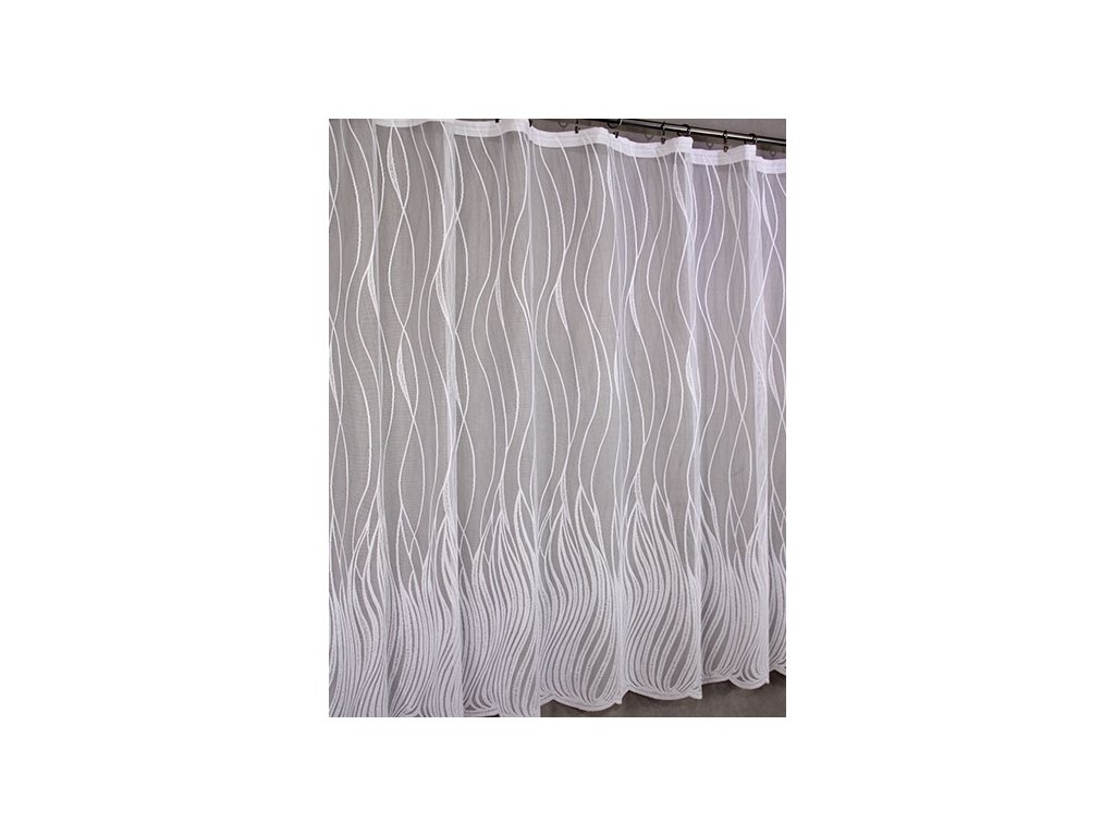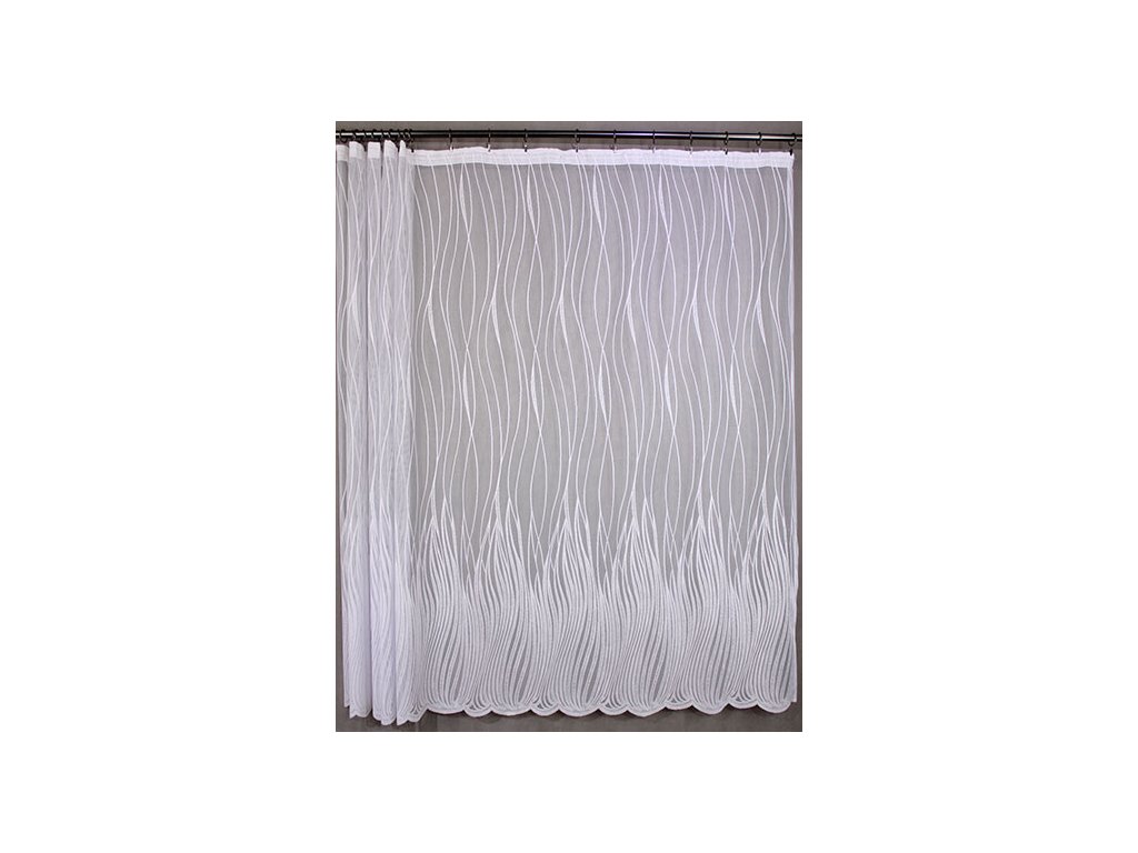 Kvalitní, žakárová, pletená, polyesterová záclona s výrazným vzorem a ve spodní části bohatě zdobenou bordurou, zakončenou do špiček. Je vyrobena ze 100% polyesterových vláken. Nahoře má tato záclona pevný kraj pro uchycení na žabky. Vyznačuje se velmi vysokou kvalitou.
