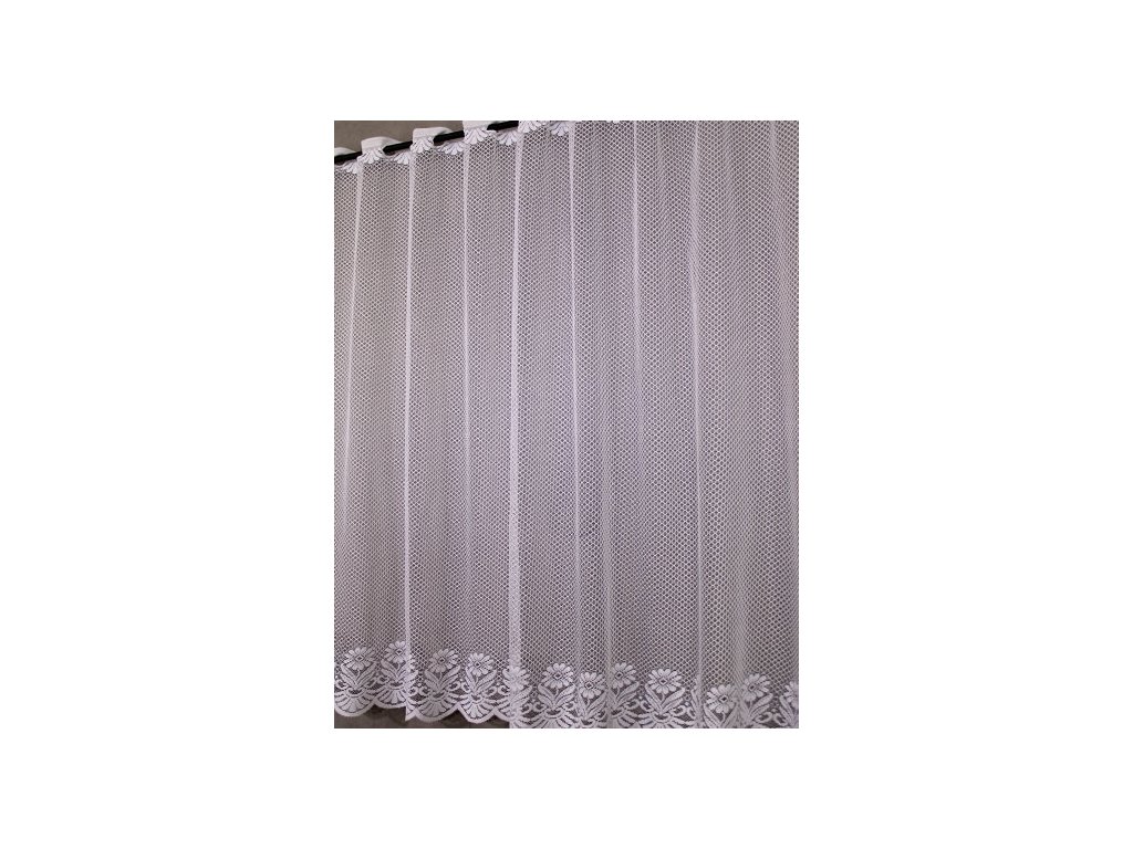 Pletená žakárová záclona s jednoduchým a oblíbeným vzorem krásnych kopretinek. Záclona na hoře je opatřena otvory na provlečení vitrážové tyčky. Materiál 100% polyester.
